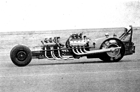 Notes: They took class wins in D/G at Pomona on Feb. 8 (87.00 mph), Mar. 2 (87.00 mph), Mar. 8 (87.00 mph), and May 17 (86.12 mph). They won at Pomona in C/G on May 3 (86 mph). Photo: "Drag cars in motion picture thread," p. 1287, in Jalopy Journal, The H.A.M.B. -- MB