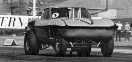 Notes: Arend's cross-species split-window Sting Ray is well-remembered by fans of mid-'60s drag machinery. With a late-model, ram-tubed 426 Dodge hemi feeding the horses though a Torqueflite trans into a quick-change rear end, a straight front axle up front and slicks suspended in massively hogged-out wheel wells in the rear, it had an in-your-face look that stuck in your head. Looks aside, Arend's "Mongoose" won Best Engineered Car at the '65 Nationals, where he reset the BM/SP speed record to 133.72 mph. The following year at the '66 Winternationals at Pomona he turned 135 mph times. |