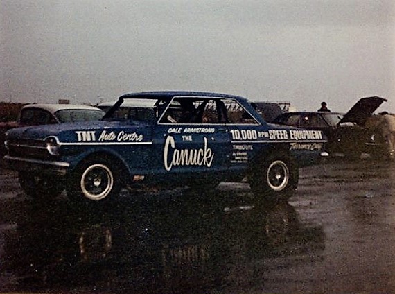 Notes: Armstrong followed the path least traveled by relying on a strong-running 352" small block Chevy for power. He claimed to never deviate from a diet of 20 percent nitro (in alky). The combo was good enough to set low qualifying time (8.33) for funnies at the AHRA Championship at Lions in late July 1966. - RT | Armstrong ran this car three different ways in 1966: injected fuel, blown fuel coupe, and blown fuel as a roadster, pictured here. This is the car he ran in 1965. In 1967, he stretched the now roofless Chevy II. In 1968, the car was run by Ron Lorenz and John Wright. - DD | On November 27, at the Lions East-West Meet, Dale put Frank Pedregon's Chrysler Hemi in the car. He ran 9.32 in the opening round to beat Eddie Marcek's Mustang, and he got out of shape in round two, where he lost to Ronnie Runyan. |