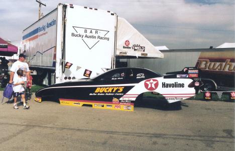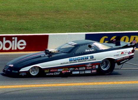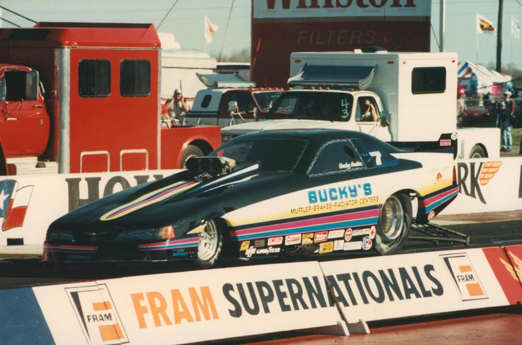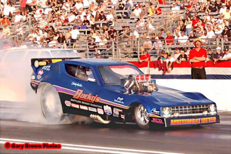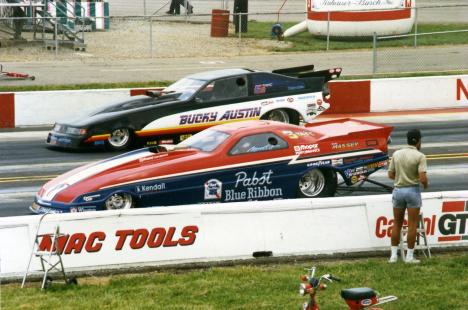 Notes: Winner at NHRA D6 Nl'akapxm BC 1989 with a 6.19 230.42 over Roger Bateman. Early in August, Bucky was at Seattle for the NHRA Seafair Nationals. His 6.07/230.53 qualified second behind Chris Christensen's 6.00/234. In the opening round, his 6.14/229.41 defeated Mike Gordon's 6.27/221. Terry Mullins fouled against him in round two, and he advanced with a 6.12/229.82. Another 6.12 at 228.83 stopped Lou Gasparelli's 6.20/223 in the semifinal. He faced Pat Austin for the title. Pat qualified third and had run steady 6.0s to reach the final. But this was Bucky's day, and a consistent 6.12/228.19 scored him his first NHRA National event win over Pat's 6.15/226. Sometimes's uncle knows best! The following week (August 13), he was at Firebird Raceway for the Nightfire Nationals. It was an eight-car field, and he qualified #3 with a 6.60/212.68. He soloed with a 6.50/213.69 when Vic Phillips broke. His times continued to improve in the semifinal, where his 6.40/217.83 (Top Speed) beat John Weaver's 6.60/212. This time, his final-round opponent was Rick Henkelman. Once again, Bucky picked up the trophy, running Low ET at 6.37/216.78 to win over Rick's 6.59/206 runner-up effort. Photo from Columbus 1989 (far lane). Original pre-Internet draglist entry. Listed times from The Drag Racing List, Winter 89/90, Volume 5, Number 1. |