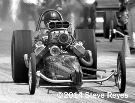 Notes: AKA California Woody. The photo may have been taken in the mid-'60s in MN at his parents' house. | Dave was driving the "Babler & Clark" car at a sixteen-car show at Irwindale on April 2. He beat Dave McKenzie in the first round, with a 7.82/200.00, and in the second round, a 7.88/197.80 beat Don Hampton. In the semifinal, he lost to the eventual winner, Mike Snively, in the "Hawaiian." The following week (April 9), he was back at Irwindale, where he lasted until the second round before losing to Snively again. On April 23, Irwindale held another one of its weekly sixteen-car shows. Dave qualified #9 with a 7.89, but met the low qualifier, the "Hawaiian," in the first round. Babler tried hard, running a 7.68/209.40, but again he lost to Snively (7.45/210). Luck was on his side, however, when Nick Marshall had won his first-round race, but had lost his engine and was unable to run the second round. Dave got back in on the "break rule," having run the lowest ET of the first-round losers. He was reinstated. In the second round, he beat the "Howard Cam Special" with a 7.75/205.46. Dave ran his best time of the day in the semifinal, a 7.60/206.42, but he lost to a holeshot 7.63/196 by Jim Dunn. On May 1, he was a San Fernando for an eight-car event, and while he didn't win or even make the final, he did set Low ET and Top Speed at 7.84/212.76. |