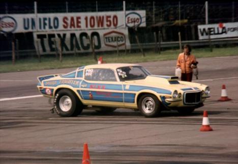 Notes: On April 2/3, 1972, Santa Pod reported that 23,000 people attended their Easter meet. Tony Dickson debuted his new car, a genuine US-built Pro Stock 1968 Camaro, 'Money Hungry,' which had rolled off the boat just a few days earlier. He took the win in Top Street on both days with a series of low 12s. On May 28/29, 1972, Santa Pod held its Big Go. Tony Dickson took the win in Top Street on both days' eliminations. His winning times were 12.25/112.87 on Sunday and 11.99/114.29 on Monday, beating Thom Marshall's Plymouth Barracuda at 12.40. On July 8/9, 1972, Santa Pod held its "3rd Internationals." In Top Street, Sweden's Gunne Back took his 'Frighten Chicken' 427 Corvette to the title honours despite some startline trickery from Tony Dickson in Money Hungry. Back patiently waited just outside the pre-stage beam while Dickson performed three burnouts. Dickson then staged, followed by Back, who then pulled a superb holeshot and took the win. On October 21/22, 1972, Santa Pod held the BDR & HRA G-Max Grand Trophy Meeting. Tony Dickson ran 11.88/117.92 in 'Money Hungry' and took Top Street with a solo 12.01/118.91 after Kevin Pilling failed to show. On November 4/5, 1972, Santa Pod held another BDR & HRA Meeting. Keith Harvey ran a season's best of 11.26/121 in his 440 cubic inch Camaro, 'Firebrewed,' making him the quickest Stocker in the UK. He defeated Tony Dickson in Money Hungry and, in the Top Street final, Gary Goggin in the 'Super Vette' after a two-minute burnout (burndown?). - Allan Currans, http://www.theaccelerationarchive.co.uk/ |