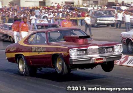 Notes: Low qualifier at AHRA Fremont on 3/30/74 at 8.922/153.84. Also ran 8.93 at Fremont, then won the event over Sonny Bryant. | Bill ran 8.94 to qualify #4 at the AHRA Winternationals. Unfortunately, he was a little tired and his first-round 9.25/149.75 lost to Sam Scott's 9.45/144. At Pomona for the NHRA Winternationals, a 9.034/150.75 qualified #6. In the first round, he beat Bob Coleman's 9.17/150 with a 9.12/149.25. In round two, a 9.22/144.92 lost to Wayne Gapp's 8.99/151. Bill did not run any other NHRA national events after the Winternationals. He was at Famoso for the Bakersfield March Meet, where he cleaned house. He qualified #1 with a 9.10; the next closest qualifier was at 9.30. Bagshaw went on to win the event, setting Low ET and Top Speed at 9.08/149.50 along the way. As mentioned above, he won the AHRA Northern Nationals at Fremont on March 17 with all the honors: Low ET, Top Speed, and number one qualifier. He took his third big win of the young '74 season on April 6 at the AHRA Grand American at OCIR. Bill qualified #2 with a 9.00 and in the final, he beat low qualifier Larry Huff with a 9.04/152.54 (Top Speed). Bill went on to win the next AHRA Grand American as well. It was held at Green Valley in May. A 9.02 qualified #,2, and he went on to beat Warren Johnson's 9.21 in the final with a 9.11. At NHRA's second Division 7 race held at Sacramento in June, Bill qualified #3. He won the event with a 9.21/145.17 in the final over Sonny Bryant's late 9.10/150. He won the next Division 7 race as well. It was held at Irwindale, and there, his final round 9.11/149 stopped the Pinto of Lee Hunter. Bill had an unfortunate accident in St. Louis in July. He was there running at the AHRA Gateway Nationals when his car got out of control and crashed into the stands. Two people died and another 19 were injured in the crash. |