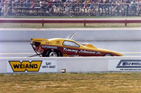 Notes: Tommy was the fourteenth member of the Cragar 4-Second Club on September 29, 1990, with the 4.964 at Topeka. Tommy started the season at Pomona, failing to qualify (10.37/79.71). At the NHRA Arizona Nationals, his 5.04/275.48 cracked the top half of the field (#7). Unfortunately, a tire-smoking 9.01/90.27 in the opening round lost to Gary Ormsby's 5.07/278. He was at Houston for the NHRA Supernationals, where his 5.03/283.73 qualified #10. Both he and his first-round opponent, Shirley Muldowney, smoked the tires but Johnson's 6.01/267.93 crossed the finish line first in front of Shirley's 6.59/207. In the second round, his 5.38/211.41 fell to eventual winner Dick LaHaie's 4.96/279. The next race on the NHRA schedule was the Gatornationals held in mid-March. Tommy "only" qualified #13 with a 5.20/273.55. In the first round, he stepped up to a career-best 5.01/284.81, but he lost to a holeshot-aided 5.06/277 from LaHaie. He did race at the NHRA Winston Invitational at Rockingham. Photo from Indy 1990. ET and speed confirmed by Jim Hawkins' DragStats. |
