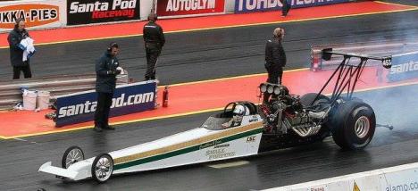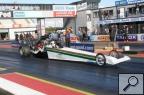 Notes: Martyn Jones shoes the Jones and Crunkhorn Another Small Fortune Super Pro ET dragster. He dialled in 6.00 seconds which is as quick as SP ETs are supposed to go. Somebody forgot to tell Martyn who carded 5.90, 200.53 and 5.86/233.54. Listed in the generic TOPDRAG category, but a Super Pro car. |