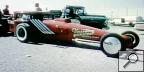 Notes: Unique competition coupe combined a fully cloaked dragster body (124" wheelbase) with an upright '34 Ford pickup cab hanging off the back. A Weiand manifold with eight carbs topped the stroked '57 hemi. The team garnered the "Best Appearing Car and Crew" award at the '58 Nationals. The subject of a two-page feature in the February '59 issue of Hot Rod. - RT Oklahoma City, Okla. 9/58 ('58 Nationals); He clocked 130.43 mph at the U.S. Nationals. Photo: "1958 NHRA U.S. Nationals--Oklahoma City, OK," 6/49 mark on YouTube video -- MB |