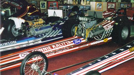Notes: Connie ran then-quickest 7.17 at Winternationals in 2/67 but did not back it up. Won Triple Crown (all 3 Winter events that year). Qualifying numbers were 7.401/219.50 at Pomona Winters 67. | Connie qualified #1 at the AHRA Winternats with a 7.46. He advanced past the first-round when Dave Powers fouled and then ran Low ET at 7.44 in beating Chris Karamesines in round two. He beat Leroy Goldstein in the third round and John Mulligan in the semifinal. In the final, a 7.63/196.00 beat Bob Downey's 8.05/196. The numbers mentioned above qualified #16 at the NHRA Winternats at Pomona on February 5, and he went on to win. He opened up with a 7.289/214.28 to beat Chuck Griffith, while in the second round, a 7.249/214.78 beat Mike Snively's 7.35/212 in the "Hawaiian." In round three, the car continued to run quicker, hitting a 7.220/214.78 to stop John Mulligan's 7.39/212 from advancing. He faced the only other SOHC-powered car to qualify, Pete Robinson, in the semifinals. Pete got out of shape and shut off while Kalitta moved into the final with a 7.231/215.82. He ran Creitz and Greer's car in the final with Gene Goleman driving. For the final, Connie upped the nitro percentage from the 85% he had been running to 1988%. He took the victory with a Low ET shot of 7.173/218.43. It was interesting to note that the car was running a stock displacement 427 with aluminum heads. Ford had dynoed the engine at 1,640 hp on 85%. It weighed 1,280 lbs. Kalitta then won the NASCAR circuit opener at West Palm Beach. He bypassed the Bakersfield Meet to run at Deland for the NASCAR Winter Championships. He ran 7.29 (Low ET) at 205.46 in the opening round to beat Karamesines, a semifinal 7.44/202.70 defeated Joe Jacono, and a final round 7.44/207.80 beat Chuck Kurzawa in the Probe for the title. On April 2, at Fremont, Tommy Ivo ran Connie in a best-of-three-match race. Kalitta's 7.49/205.94 beat Ivo's 7.54/206 in the first race, but he failed to start for the second run giving Ivo a win even though he blew his blower on the single run. On the tie-breaker, Ivo's 7.74/210.28 beat Kalitta's 7.86/209.30. On April 8 for the HRM Championships, Kalitta (7.37) lost a close first-round race to Mike Sorokin's 7.36. At Oklahoma City on April 23, the two Winternationals finalists met for a match race. Gene Coleman won the first race with a 7.25/210.76 over Connie's 7.39/198.22. The Bounty Hunter took the second race with a 7.27/206.88 over Gene's blower-popping 7.36/184. Connie won the match when Gene was unable to run the final race. On May 14 at Motor City Dragway, Michigan, Karamesines met Kalitta for a match race. Connie won the match in three straight with a first-round 7.92/207, beating a sleepy Chris at 7.49/194. In the second race, the Greek fouled, and on the third run, Connie soloed for the win with a 7.75/200. Another best of three match race was run at Milan where he faced Dick LaHaie. In the first race, Dick soloed for the win when Kalitta's Ford failed to fire. After Dick ran, Connie fired the car and ran a 7.67/208.76. He evened up the score in the second race, winning with a 7.32/209. But in the last race, the big Ford came up ailing running on only seven cylinders. Kalitta attempted to make a race out of it, but when he saw the oil pressure at zero, he shut off to an 8.20 loss. On May 28, Connie set a 7.16 track record at Union Grove during the Olympics of Drag Racing. He made it into the final against another SOHC Ford, Pete Robinson's. In the final, Pete ran a 7.17/219 over Kalitta's off pace 7.61/195.65. On June 11 at Bristol for the NHRA Springnationals. Connie was one of only two drivers that qualified not using Goodyears. He and Tom McEwen were using M&H's. After qualifying #8 at 7.251/222.22, a first-round 7.199/193.96 beat an out-of-shape Al Friedman, but in round two, a holeshot 7.13/215 from Mike Sorokin beat his quicker 7.079/218.96. On June 25 at Tri-City, he won again for the NHRA Division 3 race. Kalitta found himself at Englishtown on July 26 for a best of three match against Snively.Mike fouled in their first race, and Kalitta won with a 7.53/204.54.The "Hawaiian" lost fire for the second race, and Conrad shut it down to 8.45/182.18 to win the match two straight.They both came out for a final run, and this time Kalitta fouled, although he turned the best times, a 7.48/212.26.The speed was a new track record. On August 13 at Pittsburgh for the All-American Fuel Championships, he ran a 7.42/204.08 best but failed to make the finals. At Indy, he qualified #3 with a 6.817/208.32 and made it to the semis. Connie won round one at 6.850/208.80 over Wayne Griffiths at 7.27/207. Earl Binns did not show for their race in round two, and Kalitta coasted to a 9.42/92 win. He beat Chuck Hepler in round three with an 8.87 shutoff when Hepler fouled. Connie fell off to a 13.13 in the semis, losing to James Warren. Another win came at the NASCAR season finale at Atco, where a final 7.03/213 beat Ron Rivero. Kalitta had run a 6.97/208.80 in the first round. At the NHRA World Finals at Tulsa, Connie was the third alternate at 7.500/210.00. Rick Howard photo from Don Garlits Drag Racing Museum. |
