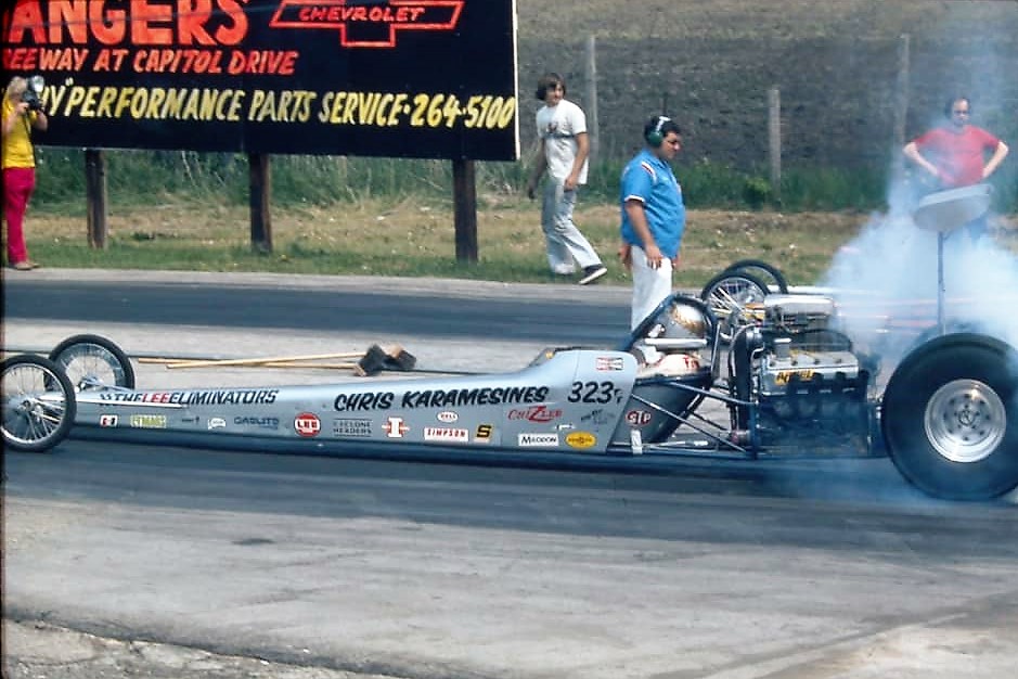 Notes: Chris started the '80 season by qualifying #4 at the AHRA Winternationals. He lost to Shirley Muldowney in the first round. A week later (February 3), he was at Pomona for the NHRA Winternationals, where his 6.028/232.55 qualified on the "bump." He lost a motor in the first round and the race. Both he and Bob Noice ran 6.100 (The Greek's at 234.37), but Bob got the win light. He made an amazing pass at the Bakersfield March Meet during qualifying. The car got completely sideways at around 150 mph, but Karamesines somehow saved it. In June, he was in St. Louis for the AHRA Gateway Nationals. His 6.34/218.98 qualified #5. He lasted until the semifinals before his 6.52/214.80 lost to Jody Smart's 6.39/224. Karamesines qualified #7 in the eight-car field at Martin, Michigan, for the PHR Championships. Chris won round one over a broken Mark Oswald at PHR championships at 6.06/226.70. In the semifinal, an off-pace 6.48/227 lost to Don Garlits' 6.34/238. Qualified 16th at Indy 1980 at 5.923/236.22 in the last 32-car show there. He fouled against Junior Kaiser in round one and lost despite running quicker, 6.09/229 to the Greek's 5.985/230.76. Pomona and Indy were his only two NHRA national events of the year. |