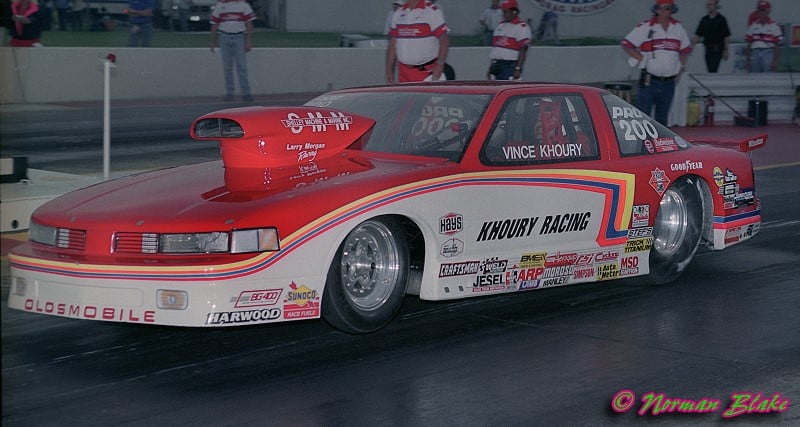 Notes: Vince started the '93 season by qualifying on the "bump" at Pomona for the NHRA Winternationals with a 7.25/191.77. A first-round 7.29/191.08 lost to low qualifier and eventual winner Warren Johnson's 7.14/193. The next NHRA event was the Motorcraft Nationals in Arizona. Unfortunately, Khoury's 7.32/189.87 best was good for the third alternate. At the NHRA Slick 50 Nationals at Houston, Vince had a repeat of Pomona. His 7.15/192.71 qualified on the "bump," and once again, he lost to the low qualifier, Johnson, in the first round. His 7.25/191.00 lost to WJ's 7.11/194. At the NHRA Gatornationals, he made big gains, running 7.14/193.46 to qualify in the top half of the field (#8). A first-round 7.22/191.32 beat Rusty Glidden's 7.25/191, but a consistent 7.22/191.08 in round two lost to WJ's 7.14/192. Vince qualified at three of the four NHRA races, and he lost to WJ in every one. Rockingham hosted the NHRA Winston Invitational, a non-points race, and Khoury qualified #15 with a 7.20/192.22. This time he lost to someone else. In the first round, Larry Morgan got him with a 7.12/192 to his 7.19/193.17. It was then on to Atlanta for the NHRA Southern Nationals. He again qualified #15, this time with a 7.23/191.69. But in the first round, he fouled against Scott Geoffrion. NHRA's sixth race of the season was the Mid-South Nationals at Memphis. For some reason, Vince missed the ballpark on this one. He could only coax a best of 7.43 out of the Cutlass and missed the show by a bunch. He rebounded nicely at Englishtown for the NHRA Mopar Parts Nationals just a week later(May 23). He qualified #4 at 7.13/194.17, but he was gone after the first-round when his off-pace 7.42/190.71 lost to Bruce Allen's equally bad 7.37/188. The next stop on the NHRA tour was at National Trail for the Springnationals. Once again, Vince had problems, and his 7.31/190.15 best was good for the sixth alternate. |
