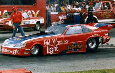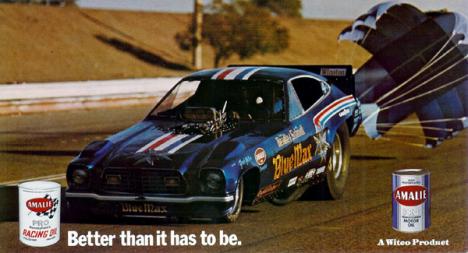 Notes: Beadle started his season at Fremont for the New Year's Day Funny Car race. Things didn't go so well as in his first race; his 7.44 lost to Ed McCulloch's 7.21 in a tire-smoking battle. He was still having trouble getting hooked up in his second race, and his 7.26 lost to Don Prudhomme's 6.41. At the Irwindale Grand Premiere race on January 5, he qualified #6 in the sixteen-car field. His easy 6.73/205.94 advanced when Dale Pulde broke on the line in the first round. In round two, he blew an engine but advanced when opponent Neil Leffler was shut off on the line with an oil leak. The "Blue Max" crew installed another engine for the semifinal match against Jim Dunn, but Beadle smoked the tires and lost to Jim's 6.46. Surprisingly, Raymond failed to qualify at Beeline for the AHRA Winternationals. Still, three cars could not answer the first-round call, so Beadle got into the show as an alternate. Unfortunately, he smoked the tires and lost to Dunn again. The team failed to qualify at Pomona for the NHRA Winternationals. Everything fell into place at Miami-Hollywood for the IHRA Winternationals. Raymond qualified #1 with a 6.39 and made his way to the final against Kosty Ivanof. There he ran the breed's best numbers, a 6.36/219.51, to take the crown over Kosty's 6.63/202. At the NHRA Gatornationals, his 6.47/215.86 qualified #6. An opening round 6.73/211.76 beat Bill Leavitt who smoked the tires, and a second-round 6.59/218.97 beat Billy Meyer, who was driving for Gene Snow. Beadle's 6.78 lost to Tom Prock's 6.68 in the "Custom Body" car in the semifinals. He was in the final of the next IHRA event as well, the World Nationals at Amarillo. Beadle qualified #2 behind Pulde driving the "Eastern Raider." These two would work their way into the final, where Pulde stopped Beadle for the victory. Another runner-up finish came at the AHRA Southwest Grand American at Tulsa. Beadle got out of shape in the final, and his shut off 8.85/113.35 lost to Dale Emery's 6.63/218 in Gene Snow's Vega. Ironically, in a couple of years, Emery was working with the "Blue Max" team. In May, Beadle's next victory came at Rockingham for the IHRA Pro-Am Championships. Beadle qualified #1 and beat Dennis Lockaby with a 7.45. In the second round, his 6.82/205.01 beat Denny Savage's 6.87/220, and a semifinal 6.72 beat Pulde. This got him into the final against Shirl Greer, and while Greer was having problems, Beadle set Low ET with a winning 6.58 at 214.28. At the AHRA Springnationals held at St. Louis, Raymond qualified #1 at 6.41/222. He set Low ET with a 6.33/212 to beat Emery in the first round, but lost to eventual winner Dick Custy in the semifinals. A week later (June 8), the team was at Columbus for the NHRA Springnationals. A 6.51/213.77 qualified the "Max" #8 in the field. Beadle beat a tire-smoking Pee Wee Wallace in the first round, with a 6.49/210.28. In round two, his 6.44/225.00 took out Emery's stout 6.46/217. He kept the pressure up in the semifinals, turning a 6.44 to beat McCulloch's 6.51. His final round foe was Prudhomme. Don had set Low ET in qualifying with a 6.29, but he was getting slower during eliminations while Beadle had been getting quicker. The "Snake" had run 6.31, 6.40, and a tire-smoking 6.84 to reach the final. The "Blue Max" was loaded for bear (Snake?) for the final, and it was expected to be a good race. It was for the photographers, at least. Just after leaving the line, Beadle started going into a wheelstand. As the front end lifted, the body released from the chassis and went end over end onto the track. The chassis came down hard, but Raymond got it stopped, and he was OK. We needless to say, the "Snake" drove to his third straight NHRA victory. Beadle got a measure of revenge at Cincinnati, Ohio, for the third NHRA Division 3 race. These two would meet again in the final there. Beadle showed that he had some upstairs horsepower by taking Top Speed at 229.08, and in the final, his 6.43/219.51 beat Prudhomme's troubled 7.19/147. It was then off to Bristol for the IHRA Springnationals. Beadle qualified #1 with a 6.42/214 and looked like a sure bet to win after running 6.43 over Kenny Safford and 6.53 over Pulde. But in the semifinals, he burned the tires off it, and his 6.66 lost to eventual winner Snow's 6.36 (Low ET). Gene was returning to the driver's seat after his back operation. The "Max's" next win came at the IHRA Summernationals at Union Grove. A final round 6.47/174.08 got the victory over Pat Foster in the "Chicago Patrol." They did not have a good outing at the NHRA Summernationals at Englishtown. Beadle only qualified #12 with a 6.55/215.31, and in the first round, he had a tire-smoking dual with Jim Liberman that saw them both run 7.02 (Beadle at 209.79), but "Jungle" got the win and would go on to win the race. Near the end of July, the "Blue Max" started its Northwest swing. The team was at Portland for the big 32-car Coca-Cola Championships. This was a race that had all cars run three rounds of racing. Beadle won his first race with a 6.50/214 over Jeff Courtie, and in his second race, he faced Jerry Ruth. Almost as soon as the "Max" started the northern tour, these two developed a rivalry. In this race, Ruth took the win with a 6.38 over Beadle's 6.52. The third race was worth the price of admission as he took on Liberman, and it was a great race as Raymond set Low ET with a 6.28 over "Jungle Jim's" strong 6.42. The next stop was at Edmonton, Alberta, for the Funny Car Spectacular on July 30. It was another three-round affair. Beadle beat Russell Long in the "Sundance" with a 6.56/200 in his first race, and he soloed with a 6.42/202 in his second race when Norm Wilcox failed to get the "Hawaiian" fired. The last race saw the tensions rise as Beadle got out of shape and crossed the centerline, sideswiping Gene Snow. Luckily, the damage was light to both cars. Then came the Seafair Championships at Seattle. It was another three-round, 32-car show with the tw