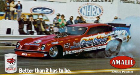 Notes: Raymond won the 1974 AHRA Winternationals beating Don Prudhomme in the final. He did not qualify a the NHRA Winternationals, however. Raymond was at Atco Dragway in May for its Factory Showdown race. It was an eight-car show, and in the first round, his 6.67/225.56 (Top Speed)defeated Pete Hill's 6.98/200. In the semifinal, a 6.65/207.85 beat the "Pabst" Charger's 7.14. He faced Pee Wee Wallace in the final, and the two had a great race that had Wallace's 6.57/214 come out on top over Beadle's better 6.55 (Low ET) at 225.56. He went to Columbus for the NHRA Springnationals but failed to qualify. Beadle won the Funny Car Spectacular at Englishtown on July 3. Twelve cars ran the first-round, with the four lowest ETs moving into the semifinals. In the first round, Raymond's 6.59/210.77 beat Fred Goeske and advanced into the semis. There, a 6.77/161.87 got him into the final when Billy Meyer's Mustang II broke on his burnout. He went up against Tom Prock in the "Custom Body" car in the final. Beadle's 6.65/192.71 beat Prock's 6.72/213 for the victory. Back at Englishtown on July 14 for the NHRA Summernationals, things didn't go as well as he failed to qualify, ending up as the second alternate. That and Pomona were Raymond's only two NHRA national events this year. | Draglist contributor Rick Howard has a great photo of Barbara Coil, dressed in her skimpy backup girl outfit, reaching into this car with the following story: The US Air Force actually used this photo for their traffic safety program dated circa 1982. Unknown photographer showing Raymond Beadle behind (I believe) Barbara Coil at Muncie (I guess again), circa 1974. I was the Traffic Safety Director (civilian) for the Wright-Patterson (Ohio) AFB Safety Office. I had to actually show this slide (the only one related to drag racing) to hundreds of Air Force trainees for years before they decided in 1985 to turn in the program and destroy the same at Norton AFB, Calif., because of the content the photo. Instead of destroying the 35mm slide, I kept it. Strange, but true. - RH |