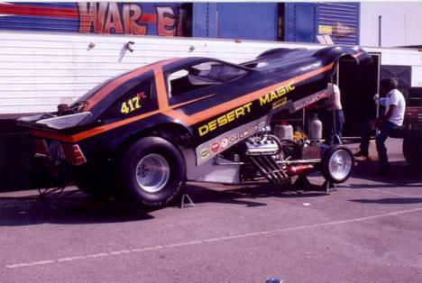 Notes: Another "character" from the 70s, Dave "Nasty" Benjamin ran altereds and his early Funny Car efforts from his chassis shop in Albuquerque, NM. Benjamin alternated between racing Funny Cars and AA/FAs during the 70s. first funny car effort was Corvette in 72. This car, photographed at the 78 AHRA Winternationals, was destroyed on its maiden outing. Benjamin later took over the cockpit of Nelson Lengle's "Sno-Town Shaker" entry to finish out the 78 season then fielded his own floppers through the 80s and 90s. Benjamin was one of the sport's unheralded innovators introducing 3 valve heads, one of the first dual fuel pump system (80), etc. "Nasty" took his last funny car ride as an owner at the 1999 AHRA World Finals at Spokane. is currently doing occasional driving chores in the "Impulse" Funny Car. |