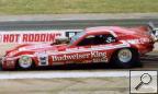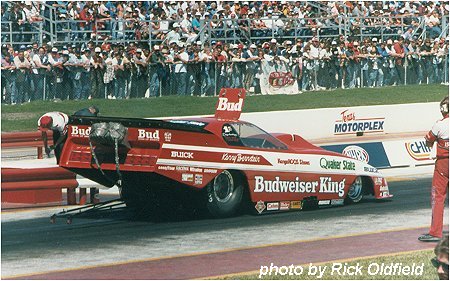 Notes: Kenny's first year with Budweiser sponsorship. He crashed the brand new car at the press conference. Kenny started the '80 season with a runner-up finish to Don Prudhomme at the OCIR Super Bowl of Drag Racing event. At the NHRA Winternationals, he qualified #2 with a 6.06/233.16. He lost to Dale Pulde when he hit the guardrail in the first round. He got out of shape, crossed the centerline, and hit the rail. He was OK, but the Arrow body was wrecked. Bernstein went to Famoso for the Bakersfield March Meet but failed to reach the finals. A 6.06 qualified #4 at the NHRA Gatornationals, but he slept in the first round, and his 6.18/232.55 lost to Tom Hoover's 6.24/229. A week later (March 23), he was at Darlington for the IHRA Winternationals, but he failed to qualify for the eight-car field. He was at Rockingham on April 20 for the IHRA Pro-Am Championships. His 6.12/228 qualified #1 for the eight-car field. In his first-round race against Billy Meyer, Bernstein accidentally shirted back into low gear, and he lost to Meyer's 6.15. The following week, he qualified #5 at Baton Rouge for the NHRA Cajun Nationals, running 6.11/241.93 for the spot. It was an eight-car show, and by qualifying #5, it set up a first-round race with low qualifier Paul Smith in Larry Coogle's "Sting" Firebird. Paul won the race when Bernstein smoked the tires and shut off. On May 4, he was runner-up to Raymond Beadle in the "Blue Max" at the rain-delayed IHRA Dixie Nationals. At Bristol for another rain-delayed event, the IHRA Springnationals, he qualified #3 in the eight-car show with a 6.21. He lasted until the semifinals, where his 6.59 lost to eventual winner Meyer's 6.44. The "Budweiser King" wasn't running that well at the NHRA Springnationals, only qualifying #10 with a 6.22/232.55. He lost to Dale Pulde in the first round. He also lost in the first round at the next NHRA race, the Mile High Nationals in Denver. Kenny qualified #7 in the eight-car show, but his 6.57/225.00 in the first round lost to Beadle's 6.29/226. He then went to Alamo Dragway in San Antonio, Texas, for the AHRA Nationals. It was another eight-car field, and his 6.33 qualified #5, setting up a first-round encounter with low qualifier Prudhomme. It was a close race, but the "Snake's" 6.19 beat Kenny's 6.20. He won the NHRA Division 2 race at Blaney, beating John Speelman in the final with a 6.43/233.16 (Top Speed and a new track record). He earlier had set Low ET at 6.37. At Englishtown, he qualified poorly, only running 6.14/237.46 for the #11 spot, and in the first round, he lost to Prudhomme. Early in August, he was at Bristol for the IHRA Summernationals. He qualified #7 in the eight-car field with a 6.52, but in round one, he smoked the tires to a shut-off 12.40 that lost to Roy Harris' 6.30/236. Kenny was at Maple Grove for the NHRA Division 1 race. He ran well, making it into the final against future crew chief Dale Armstrong, but he had problems and shut off, giving Dale's 6.20/231 the victory. Kenny was disappointed at Indy for the NHRA U.S. Nationals, where his 6.15 best failed to qualify for the race that had a 6.10 "bump." Ray Alley then came on board to help with the car for the NHRA Fallnationals at Seattle. Kenny was the first to tell you that Alley "knew his stuff" as the car responded by running a career-best 6.002 at 239.36 to qualify low for the field. However, things didn't go so rosy in eliminations, as Bernstein's 6.61/214.28 in the first round lost to Armstrong's 6.62/180. Kenny wrapped up the year at the NHRA Finals in Ontario. He qualified #13 at 6.251/224.90 (243.90?) and bat Dale Pulde in round one, 6.585/220.04 to 6.79/207. In round two, he lost to eventual winner Ron Colson, 6.21/233 to 6.304/227.84. |