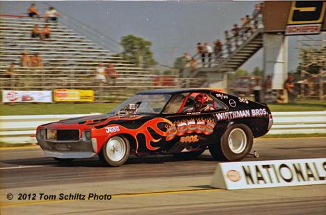 Notes: My very first drag race, and it had to be Indy in 1972. I was in town with a local friend, on leave from the Air Force, and went on a whim with a camera that held maybe 24 shots. I would learn much later that this is Ron Boggs. He had just run the all-time low for class at 7.98 in Round 2 versus Jim Oddy, but was disqualified for breaking out by .12 seconds on an 8.10 dial-in. What a way to get my feet wet. - Rick Howard | Ron won alky race at Tri-City Michigan as reported in 9/01/72 National Dragster with a 7.62/181.81. | Original 1970 entry listed a 187.89 speed, which was too fast for that year. Likely happened in 1972. We need to confirm. Saginaw MI Dragway, Freeland, MI 8/72 |