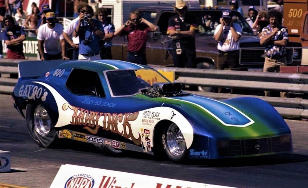 Notes: Jerry failed to qualify at Pomona for the NHRA Winternationals (#2 alternate, but times not available). Things went even worse at the NHRA Gatornationals, where he crashed during qualifying. The car was reported a total loss, but not long after the crash (May 1), Boldenow showed up at Rockingham for the IHRA Pro-Am Championships. He lost to Dale Pulde in the second round. He also lost to Pulde in the first round at the IHRA World Nationals in June. On July 4, Jerry was at Union Grove for the IHRA Summernationals. It was an eight-car show, and his 6.45 qualified #4. In the first round, Danny Pickett fouled against him. In the semifinals, Larry Fullerton broke, and Boldenow advanced with a 6.67/161. He faced Tom McEwen in the final, and the "Goose" was running well as he had set Low ET (6.15) in qualifying. Jerry tried hard in the final, but his 6.47/225.00 finished second best to McEwen's 6.28/218. He did not race at Englishtown for the NHRA Summernationals, but he was at Milan Dragway the following week (July 24) for the IHRA Northern Nationals. It was another eight-car show, and he qualified #5 with a 6.35. That gave him a first-round encounter with low qualifier McEwen. Once again, the two Corvettes lined up, and the results were the same once again. Tom's 6.24 got the better of Jerry's 6.38. Steve Gold sold the car to Ezra Boggs in late 1977. |