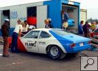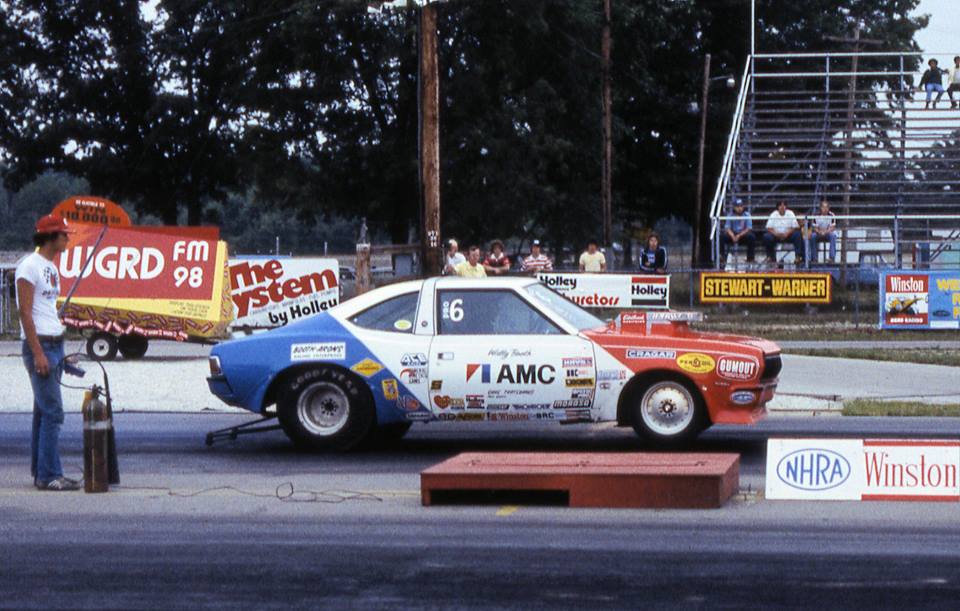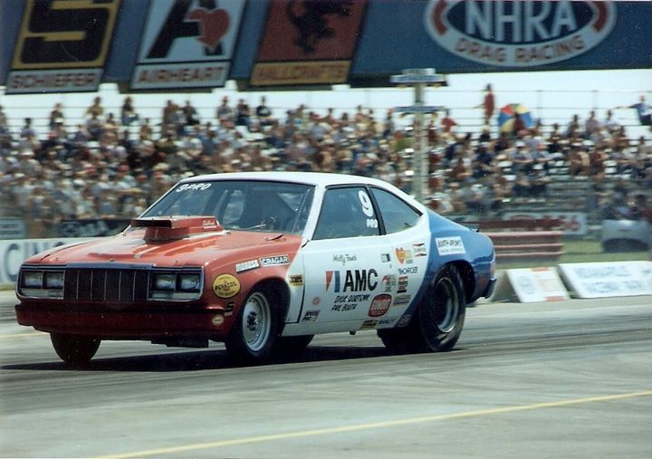 Notes: Wally started his season at Pomona for the NHRA Winternationals. He qualified #5 with a 9.03/149.75. A first-round 9.09/150.25 beat Larry Huff's Dodge, but in round two, his 9.11/150.25 lost to Bob Glidden's 9.01/152. In March, AMC informed both Booth and fellow Hornet campaigner Dave Kanners that they were releasing them from their contracts. So when the two teams showed up at Gainesville for the NHRA Gatornationals, both teams had no contracts for the rest of the season. Booth qualified #3 with a 9.05/151.51. An 8.97/152.54 in the first round beat Don Nicholson's 9.03/152, while in round two, his 9.01/152.28 beat Kanners' 9.05/150. In the semifinals, Wally ran 8.95/152.80 to beat Frank Iaconio's 9.05/152. In the final, he faced Jack Roush in the "Gapp & Roush" Mustang II. The Hornet got AMC's first-ever win in Pro Stock at an NHRA national event. Booth ran 8.97/152.80 in the final over Roush's 9.01/152. AMC was so happy with the victory that they renewed their support for the two teams. The timing for the win couldn't have been any better. On March 31, NHRA held its Division 2 Opener at Warner Robins. Wally qualified #1 with a 9.02 and then made his way into the final, where he ran Fred Shafer. Booth took the win by running Low ET and Top Speed with an 8.98/154.10 over Fred's 9.37/146. He also won the Suffolk NHRA Division 2 race in May. He qualified #1 with an 8.93/152.92 and set Low ET in the first round, with an 8.92/152 to beat Lamar Walden's Vega at 9.11. In the semifinals, he beat Roy Hill with another 8.93; in the final, an 8.97 got the victory when Kenny Hahn fouled against him. At National Trail for the NHRA Springnationals, he qualified #1 with a 9.06/150.25. A 9.15/149.00 got around Richie Zul's Camaro in the first round, but his 9.16/148.76 lost to Bobby Yowell in Billy Stepp's Dodge in round two. He won his third NHRA Division 2 race in a row when he beat Reid Whisnant in the final at Blaney. Booth's 9.00 (Low ET) at 149.00 beat Reid's 9.12/148. In mid-July, he was at Englishtown for the NHRA Summernationals. A 9.05/150.25 qualified #6 in the field. Booth beat Joe Satmary in round one with a 9.13/149.00. In round two, his 9.14/149.75 lost to Wayne Gapp's 9.10/140 in the "Gapp & Roush" four-door Maverick. The little Hornet continued to run stronger as the season progressed, and at the NHRA Grandnationals, he qualified #2 behind Gapp's 8.86 with an 8.940/150.75. He beat the other Hornet of Kanners in the first round with a 9.06/150.50. Another 9.06 in round two topped Tony Christopher's Duster, but in the semifinals, he fell off to a 9.09/149.00 that lost to Glidden's 8.90/153. The next big race was at Indianapolis for the NHRA US Nationals. Booth qualified #6 in the 32-car field with a 9.09, and he lasted until round three, where his 8.96/150.00 lost to Glidden's holeshot aided 8.99/153. He grabbed another Division 2 title when he won the final at Gainesville. Once again, he ran Whisnant in the final, and his 9.08/149.00 beat Reid's off-pace 9.35/147. Wally ran 8.94 at NHRA Sanair 74, 8.92 at Suffolk Dragway 74, 9.03 at Pomona, 9.05 at Englishtown, 9.06 at Columbus, 8.96 at Indy, and 9.03 at Ontario.Photo from the 1974 NHRA Gatornationals, Gainesville, Florida. |