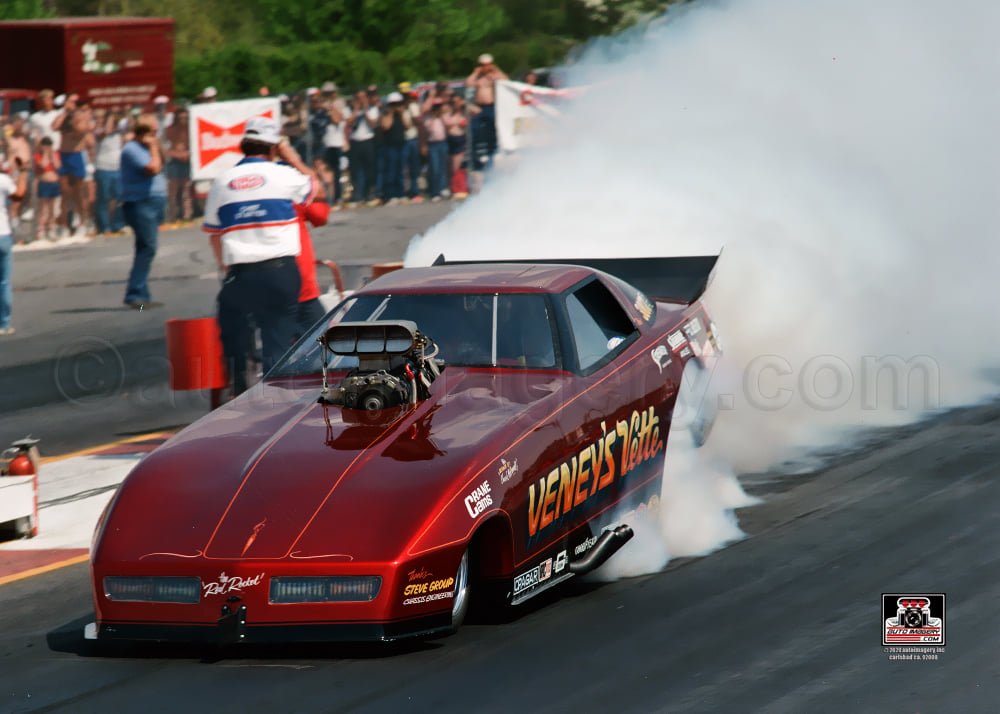 Notes: Veney had not raced at an NHRA National Event since the '84 U.S. Nationals, but he showed up at Gainesville in March for the Gatornationals. During qualifying, he was having trouble, and the best run he could make was 7.55/116.48. That failed to qualify as he was the first alternate. But Udo Horn qualified his car but had a fire and could not run eliminations. Ken took his place in the field. Lou Gasparelli fouled away a 6.43 against him in the first round, and Veney's Corvette came to life, running 6.54/216.13. He improved to 6.45/215.52 to defeat Charlie Byers in the next round, and a semifinal 6.46/215.62 took out Bogie Kell. He faced Vern Moats in the final, and Moats had trouble and shut down while Veney picked up his 13th career win with a 7.27/207.66. Ken was in Atlanta on April 21 for the NHRA Southern Nationals. He qualified #1 for the eight-car field with a 6.41/217.60. An opening round 6.49/215.20 defeated Bogie Kell's 6.62/212. But he slowed to a 6.62/214.79 in the semifinal that lost to eventual winner Moats' 6.38/220. The following week (April 28), he was at Indianapolis for the NHRA Division 3 opener. His 6.53 qualified #2 behind Steve Group's 6.44. Veney soloed with a 6.52/212.76 when Greg Moss broke. In the semifinal, his 6.77/208.61 fell to Randy Henning's 6.69/212. He did not compete at Baton Rouge for the NHRA Cajun Nationals, but he was at the Sportsnationals early in June, where he ran 6.63/212.96 to qualify #12. In the opening round, a late leaving 6.58/213.16 lost to Pat Austin's 6.61/212. Shortly after that, he was at Columbus for the NHRA Springnationals. A 6.48/214.79 qualified #5. In round one, his 6.60/212.76 defeated Don Gerardot's 6.83/203. But another 6.60 at 207.75 fell to eventual winner Moats' 6.36/220. He followed the NHRA tour into Canada for the Grandnationals held at the end of June. He ran 6.48/221.02 to qualify #6 in the eight-car field. In the first round, his 6.58/211.16 lost to Fred Mandoline's 6.36/221. He also lost early at Englishtown for the NHRA Summernationals. He qualified #8 with a 6.53/211 and lasted until round two before losing to Carol Henson. His Veney heads were a springboard to a lucrative fuel head-building career. |