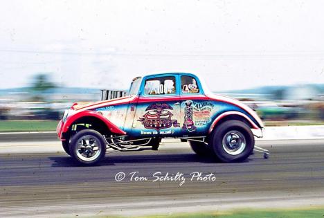 Notes: He died in a crash. George Santos' brother-in-law.; S & S Engineering mounted a blower on the Chevy motor, effectively upping it in class from C/FD to B/FD. He ran straight alcohol. The first outing with the new set-up produced very good results: 9.18 at 171.42 mph at Fremont on Feb. 21. The Top Speed was good for a new B/FD 1320 Drag News national record. At the March Meet at Bakersfield, he clocked 9.09 at 169.00 mph. Back at Fremont, his home track, he turned a very fast 175.86 mph at the big 2-day Mar. 19/20 NCDSOA event. He turned 9.38 at 168.22 mph on Apr. 24 at Fremont. The following week at Fremont, he ran 9.11 at 166.97 mph. He then towed up to Washington, where he set both ends of the 1320 Drag News national record on May 15 at Bay View Drag Strip for B/FD with 8.844 at 170.77 mph. Returning to California, he next ran at Fremont on May 28. During the meet, he set another new 1320 national speed record with 171.75 mph at 8.90 seconds. On his last run of the day, he lost control of the car at over 170 mph and was killed. Photo: George Klass Collection - MB |