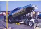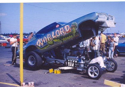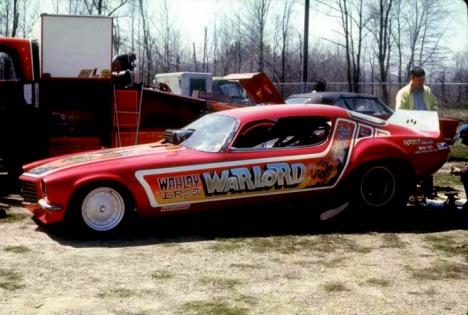 Notes: Their old Logghe car (originally a 'Cuda) with a newer Camaro body. Ran 7.26 at Tri-City. | Tony Wahlay was at National Trail on July 18 when the car got sideways and ended up in the drainage ditch that ran alongside the track. The car received major damage to the front suspension as well as the body. But the team had it back up and running within a week. |