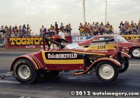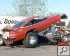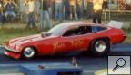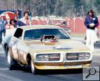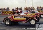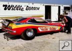 Notes: Wild Willie's Chevy-powered nitro funny car of 1973 was definitely not competitive on the national match race circuit. This was due to numerous minor "bugs." He spent most of the tour year sorting them out before getting any full passes worth recording. Being a master mechanic who could change his own pistons in his ex-Don Garlits tow truck in the middle of nowhere in the Arizona desert was certainly a plus. But changing injectors from Hillborn to Enderle, fuel tanks that were not adequately vented, losing blower belts, and burning pistons, among other things, almost every run, were some of his race car's problems. These constant disruptions prevented any match race wins. Despite the terrible year he was having, the worst of his NHRA top 50 driver career, The Wild Man lived up to his "handle." He surprised many of his opponents with great hole shots, come from behind "wins" to the eighth-mile mark :} And far out of shape two-handed driving, except when shifting, of course, somewhere in the mid-range. However, his funny car "act" with ultra wild, out-of-control smokey burnouts, sometimes in the other guy's lane, incredible wheels-up launches, and typical seat-of-the-pants driving was extremely popular with the fans then. In my opinion, his "Nitro Act" was worth more than several of the more popular and powerful Chrysler stroked Hemi Funny cars of that day who were making twice as much or more booked in money than him. Willie was match racing that year on less than a dollar, a shoestring, and a bucket of water. :} It was more like he was racing in the Funny Car Wars back in that day with nothing but a wing and a prayer. :} - Cliff Tarpy, aka Pete Allen - greenhorn crewman. |