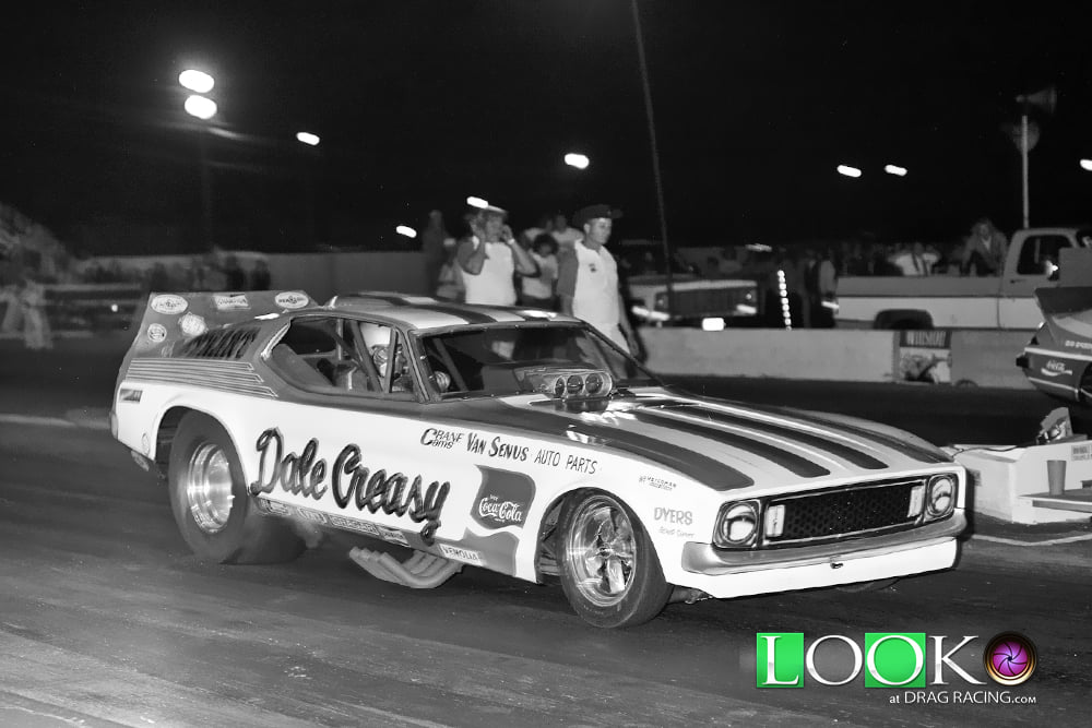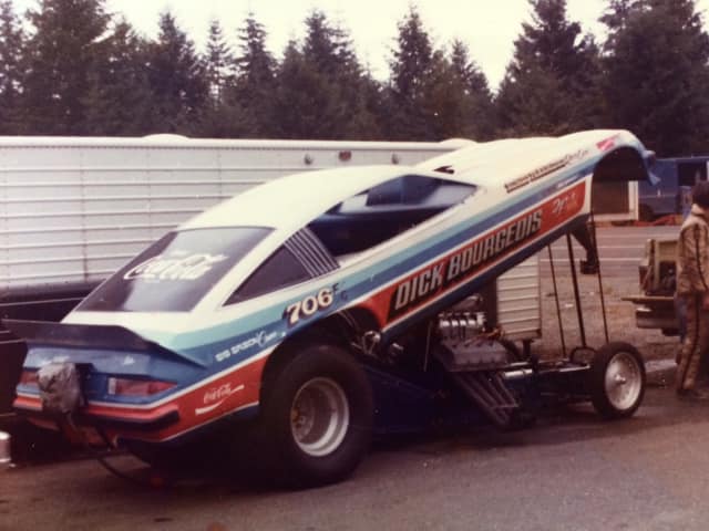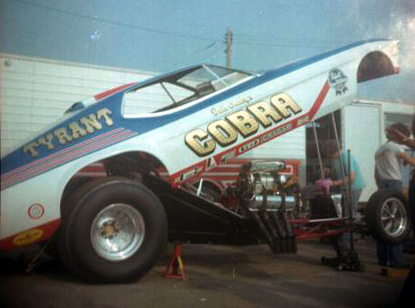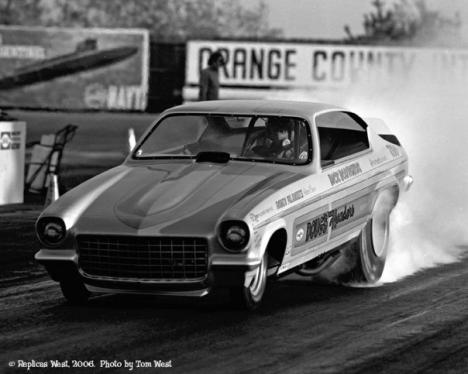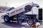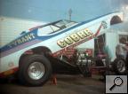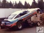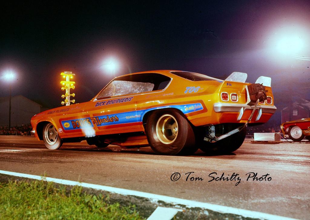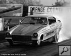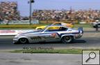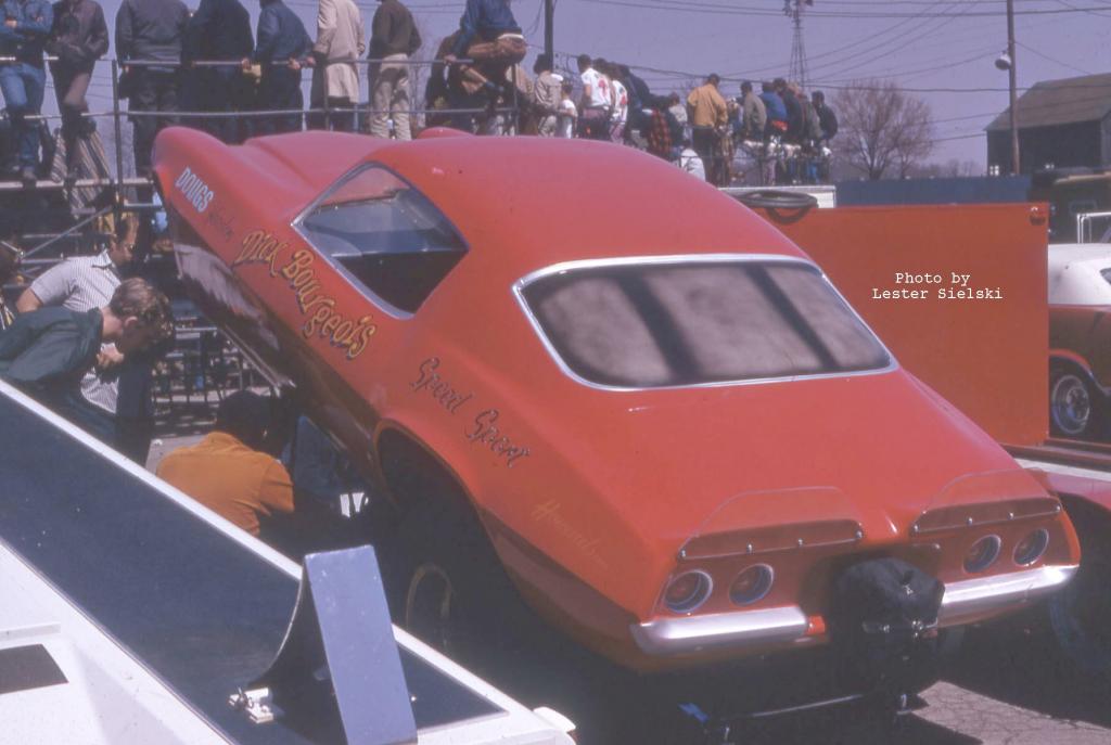 Notes: Came out with this car at the New Year's race at Fremont in 1970 (although it had debuted at OCIR on 12/14/69). Note the flower print paint job. | As mentioned, Bourgeois was at Fremont for its New Year's Day race. Only six FCs ran. In his first race, Dick ran 7.77/191.08 over Don Schumacher, who broke a rear end. He also won his second race with an 8.79/171.42 when Kip Brundage fouled in the "Parts Mart" Camaro. Dick qualified in the eight-car field at the second OCIR All-Pro race on January 18. He fouled against eventual winner Gene Conway in the first round. He was at Irwindale a week later (January 26), where he ran 7.69/184.80 in the first round to beat a tire-smoking Jim Liberman, but a second round 7.95/193.96 lost to Charlie Allen's 7.67/170. The team really opened some eyes at Pomona for the NHRA Winternationals when they qualified #1 with a 7.538/194.38. This was at a show where Leroy Goldstein, Don Schumacher, Don Prudhomme, Pat Minick, Jim Liberman, Charlie Allen, and other luminaries failed to qualify. Unfortunately, he lost to Kelly Chadwick in the first round, 7.76/193.13 to 7.85/184.80. That was Dick's last NHRA national event of the year. Lions held an eight-car show on February 14 with 30 cars trying to qualify. Bourgeois made the show but shut off against Pat Minick in the "Chi-Town Hustler" in the first round. The next day Dick was running at Fremont for the Northern Nationals. A first-round 7.42/196.06 lost to Jake Johnston's 7.32 in the "Blue Max." |