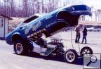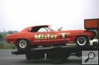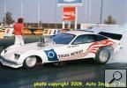 Notes: J&E body. Chassis by Mike Hoag/Blairs. Have photos of this car running a 427 Chevrolet in 1969. | After installing a Hemi in this car late April, Steve showed up at OCIR on May 3 for the second annual Manufacturer's Funny Car Open. He qualified #3 in the four-car GM team with a 7.81/189.46. In his first race, he beat the Parts Mart Camaro with a 7.77/191.84. And a 7.89/184.42 beat Ron Leslie's 8.28/182 in his second race. On May 31, at the Funny Car 500 at OCIR, he lost a driveshaft and the race against Rusty Delling in the first round, but he qualified well in the sixteen-car field with a 7.87/181.08 being good for #5 spot. Bovan ran an 8.09 to qualify ninth at the PDA Championships on July 19. He improved to a 7.90 in the first round, but still lost to Dave Beebe's 7.45. A sixteen-car race was run at Irwindale on July 26 and Steve's 7.98 just got in (#16) and he lost early. On October 11, Steve attempted to qualify at OCIR for the Funny Car Open. On a 7.71/196.65 pass, the car blew a motor and burst into flames. He was OK, but the car was out of the race. The 7.71 would have been good for the fifth qualifier. |