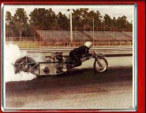 Notes: I hardly ever kept track of my ET or mph. Most of the time I ran the bike was for exhibition and just smoked most of the 1/4 mile and didn't get much traction with the old M&H tires. When I first started riding the bike I found out when it started to hook up it would raise the front wheel, so after that, when I felt the engine start to bough I'd just roll on more power and keep the tire loose. I learned that lesson the hard way. About the first time I made a hard pass, it hooked up, I pulled the chute, the bike stopped and I slid for 700 feet. I went through the lights on my, butt at 168.94 (I remember that pass). That was when I added the air dam over the front wheel. That fixed the problem and kept the forks pretty much squashed. So as long as I was not racing anyone I just let it eat. Most promoters just wanted to see smoke anyway. I built the bike in 1960 and ran it until about 1975 I guess. I was in Gainesville Fl. And tipped the can a tad too much and blew my cool injected motor to pieces. I sold it to a Friend here in Florida to restore it. He sold it to Bruce Della in Mass. I am not sure who has it now. I lived in Owosso, Michigan, when I built the bike and had Logghe Stamping Co. build the frame. I was one of the first to use a Crowerglide clutch. Thanks, Dan, 2/22/14 |