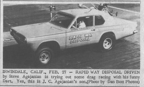Notes: At the 1965 season opener on Apr. 11 at Springfield-Ozark Dragway, Agee took a victory in top stock eliminator. Agee turned 13.54 at 105.88 mph. On Apr. 25 at Springfield-Ozark, Agee took a class win with 13.14 at 107.27 mph. He set a record in A/MP at Springfield-Ozark on June 6 with 13.23 at 105.88 mph. He set an AHRA national record and won his class in B/SA on June 13 at U.S. 30 Drag Strip at the Summer National championships. He turned 13.30 at 108.93 mph. Back in Missouri at Springfield-Ozark on June 20, he took top stock eliminator. Photo: "Vintage shots from days gone by," p. 5161, in Jalopy Journal, The H.A.M.B. -- MB |