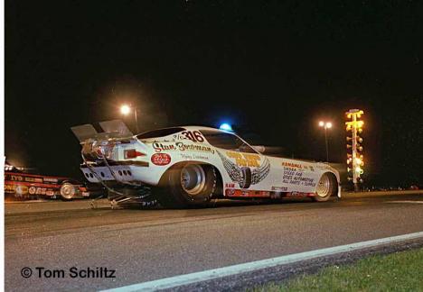 Notes: Blue Angels were a car club from Massillon. A gentleman by the name of Ralph Henson was the engine man. Ralph was a mechanic at Progressive Chevrolet. Gary Biggins was the driver. When the club disbanded, Stan Bowman bought the car. - Tom Schiltz | Ran 6.71 at Tri-City. Qualified #28 at Indy at 6.620/209.30. Lost in the first round to Gary Cochran, 6.69 to 6.77 (no speeds reported). |