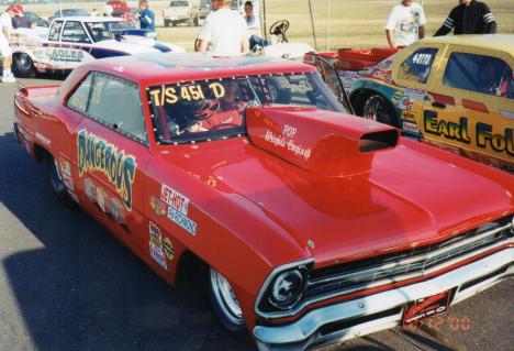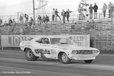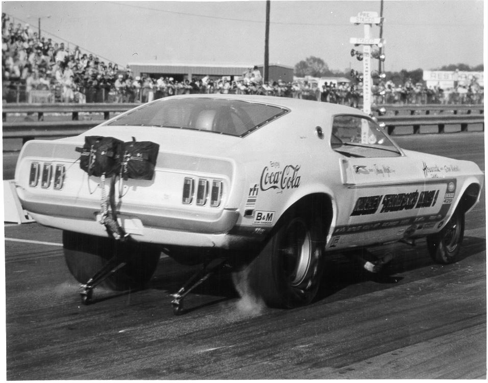 Notes: This was the Mickey Thompson "White Car" driven by Johnny Wright. After several unlucky events with the Red car, this machine was put together in late '69 and run with the Boss 429, running only West Coast events. This car ran in the Coke Cavalcade series in 1970. Have photos of the car at US 30 Dragstrip near Gary, IN. - MO |
