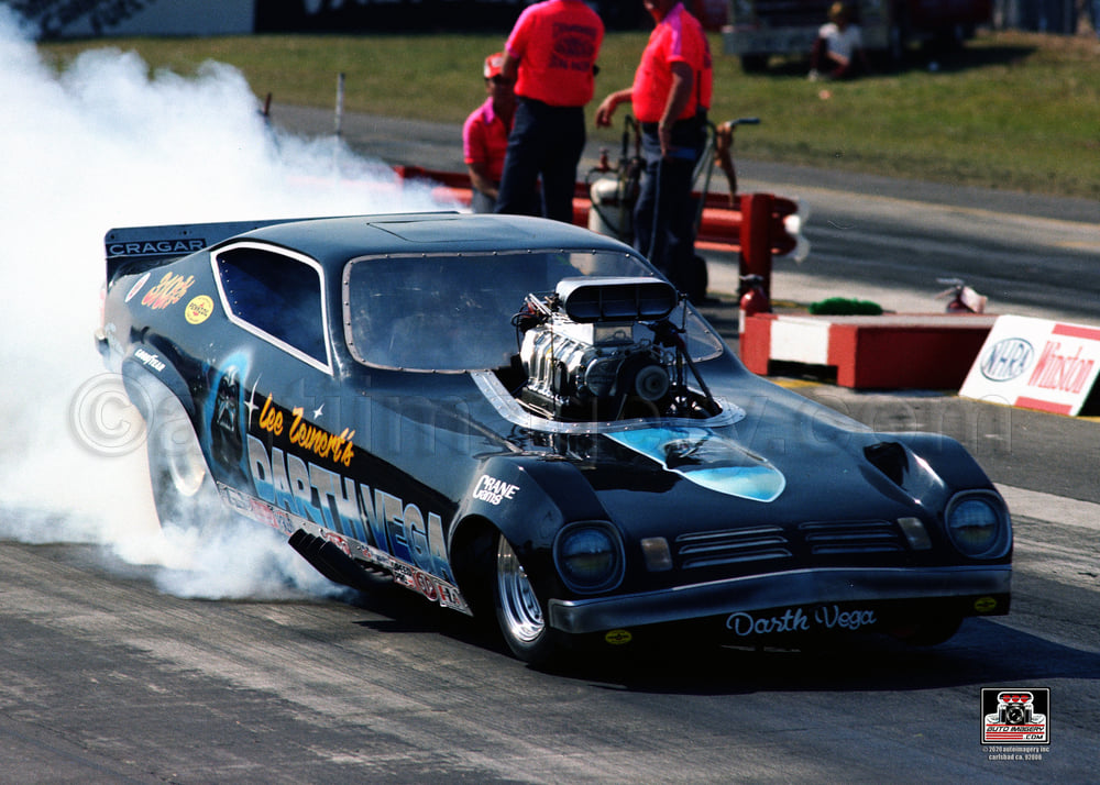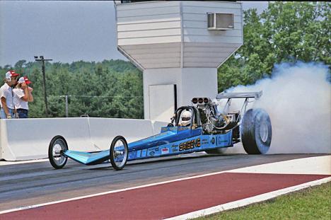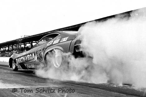 Notes: This beautiful enclosed dragster was built by the owners of Daddy's Auto Body in Burbank. They did it first class in every respect: chassis by Kent Fuller, upholstery by Tony Nancy, Buick engine specialist Max Balchowsky, and their own fiberglass body. Johnson, age 19, and Zeller, age 23, shared driving duties. They principally raced at San Fernando. Zeller set a new track record at San Fernando and drove to a TE victory on Mar. 23 at 132.54 mph. He broke that track record a week later with 137.20 mph. Tom McCourry later bought the dragster. Photo: George Klass Collection - MB |