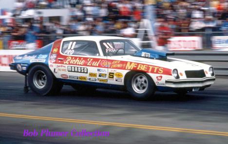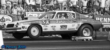 Notes: Photo from 1978 US Nationals. Won the Springnationals at Columbus with an 8.76/157.61 over Glidden. Ran 8.72/156.79 at Gainesville 3/78. Lost the quickest side-by-side race in history to Bob Glidden at the NHRA Summernationals, 8.530 to 8.660. On May 7th, Richie was at Englishtown for the NHRA Division 1 opener. He qualified #1 for the eight-car field with an 8.58. He improved to 8.56/158.73 in the opening round of eliminations to beat Don Campanello's 8.75/141. But in the semifinals, despite running another 8.56 at 159.01 (Top Speed), he lost to the eventual winner Larry Lombardo's 8.57/157. Zul qualified #5 at Englishtown for the NHRA Summernationals with an 8.70/155.97. Another 8.70 at 155.44 in the first round, beat Jim Kinnett's 8.71/154, but his 8.660/156.25 in round two lost to Bob Glidden's new Fairmont at 8.53/152.54. |
