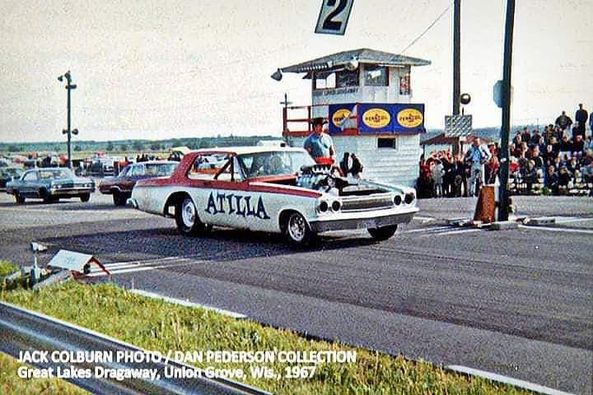 Notes: I think these are the only known photos of "Atilla," a blown fuel funny out of Chicago, pictured here in 1967. Owner/driver Charlie "Tuna" Brooks worked for Mr. Norm's Grand-Spaulding Dodge. Frankenstein-like, the '64 Dodge 330 combined a '65 Dodge front clip and a blown early hemi. Thanks to Wayne Minick for finally putting a name to the owner of this car! Photo of Atilla under the Union Grove tower by Jack Colburn from the Dan Pederson Collection. Two side views cribbed from an 8mm home movie by Timothy Airney, taken at US 30 (Gary). All images from 1967. - Ron Thums |