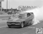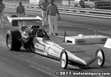 Notes: This car was completed on Saturday, November 18/1972, and made one full qualifying pass at the NHRA Supernationals that same day; the resulting 6.70/210.00 run was not good enough to make the quickest funny car field in history. Although that initial run was promising, handling problems, which were eventually traced to the poor aerodynamics of the Vega Panel body, kept this car from ever reaching its potential. Every Vega Panel tried in funny car was evil handling, lack of downforce caused them to get loose on the top end, and many were lost in crashes. |