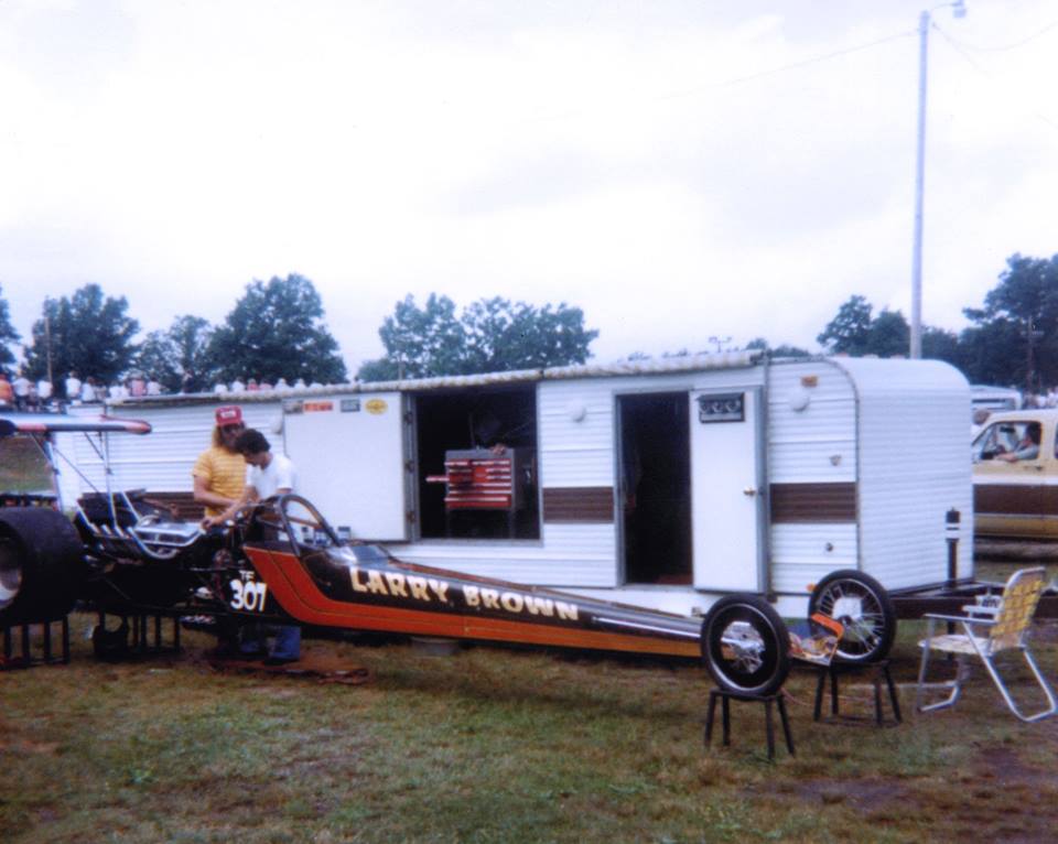 Notes: Photo from the 1975 NHRA Springnationals, National Trail Raceway, Columbus, Ohio. | Larry was at Tri-City in May for an eight-car show. He qualified #6 with a 6.76/198.67, which was pretty good considering such names as Paul Longenecker, Dick LaHaie, and Dick Rosberg failed to qualify. In the first round, his 6.54/211.76 beat Gary Dye's 6.61/200, but he had problems in his semifinal race against Bill Pryor and shut down. He failed to qualify at Columbus for the NHRA Springnationals as no Chevy-powered cars made the field. He did have the only Chevy in the field at Edgewater on June 29 for the third NHRA Division 3 race. He qualified in the dreaded #5 spot, setting up a first-round meeting with the low qualifier, Don Garlits. Garlits easily won their match with a 6.07/233, and he went on to win the race. |