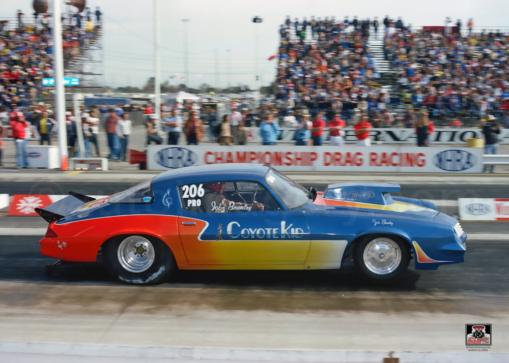 Notes: Bruins had just gotten his Top Fuel driver's license a week before he was driving Herm Petersen's car at Portland International's Rose Festival Drag Championships on June 6. It was a fourteen-car show, and he qualified #2 with a 6.14. In the opening round, the two low qualifiers got to make solos. Rob ran 6.12/237.46 (Top Speed). He got another solo in round two when Stan Shiroma could not run after losing an engine in the first round. This time Bruins advanced with a 6.10/226. In the semifinals, he came up against Hank Johnson. Hank had been running 6.20s in eliminations, but he picked up to a track record 5.93/233 to beat Bruins' 6.22/232. He won the NHRA Division 6 race at Mission Raceway. A 6.24/193.13 beat Maynard Garrity's 6.53/206 in round one, and a 6.12/233.76 in the semifinal topped Johnson's 6.26/227. He was to face Bob Mitchell in the final, but Bob had problems and was a no-show. Bruins made a 6.41/166.97 solo for the win. Rob did not race at the first PDA Championship race held in Seattle. Rob beat a fouling Garlits at the second PDA Championships race at Fremont. His final round times were 5.96/236.22. Rob finished #2 in Division 6 in 1976 while filling in for Herm Petersen. He also ran 6.07/229 at Irwindale WCS. |