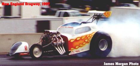 Notes: Gerardot's '87 car. 125-inch wheelbase. Ran 6.74/204 at MIR's Superchargers Showdown on 10/04/97, but blew the connecting rods through the block, oiled the track from the starting line until the eighth-mile, and put his Fiat altered into the other lane and onto its roof during the pre-race burnout! This necessitated a long cleanup from which the right lane never really recovered. Schuster was unhurt. - Bill Pratt |