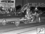 Notes: Don qualified #29 at NHRA Pomona at 7.110/213.27. He lost to Gary Cochran in round one, 6.892/202.70 to 7.488/217.91. That was his only NHRA national event of the year (Dick Boufgesous drove his Corvette FC at Pomona). Sixty-six Top Fuel cars showed up at Fremont on February 15 for the Northern Nationals sixteen-car field. Don qualified, but he blew a rear end in the opening round and lost to eventual winner Steve Carbone. The following week (February 22), he was at OCIR for the third All-Pro race. It took a 6.86 just to qualify for the eight-car field. Cook made the show, and his 7.16/182.18 advanced over a fouling John Wiebe in the first round. He caught a good light in the semifinal, and his 6.83/192.71 held off Jim Dunn's quicker 6.77/204. He faced Gary Cochran in the final, and Cook was forced to shut off with an oil leak. He did not race at the Bakersfield March Meet, choosing to compete at the Lions AHRA Grand American race run the same weekend (March 8). In the opening round, his 6.93 advanced, but an ailing 7.61 in round two lost to Don Garlits' 6.65. Near the end of March, he returned to OCIR for its final All-Pro race. Don failed to qualify for the sixteen-car field but got in as an alternate for Kelly Brown, who broke. In round one, an off-pace 8.24 lost to low qualifier Norm Wilcox's 6.74/189. -- RH | Cook demolished his dragster while racing Chris Karamesines at Union Grove, Wis. on July 5, 1970. -- RT |