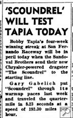 Notes: It appears the Sandoval Bros. split with teammember Madden at mid-year; news articles indicate they debuted a new rail -- "Scoundrel" -- in mid-December. Gary Gabelich drove this car as well, between frequent stints piloting the "Valkyrie" jet dragster. Times cited from Dec. 12 shakedown runs. -- RT |