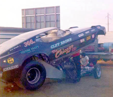 Notes: Stock Stroke Hemi. Wrecked in June, and featured the still unpainted body at this August race. We need to confirm that Cliff had the Mustang II in 1974 and replaced it with this old body after the crash. - Danny White |