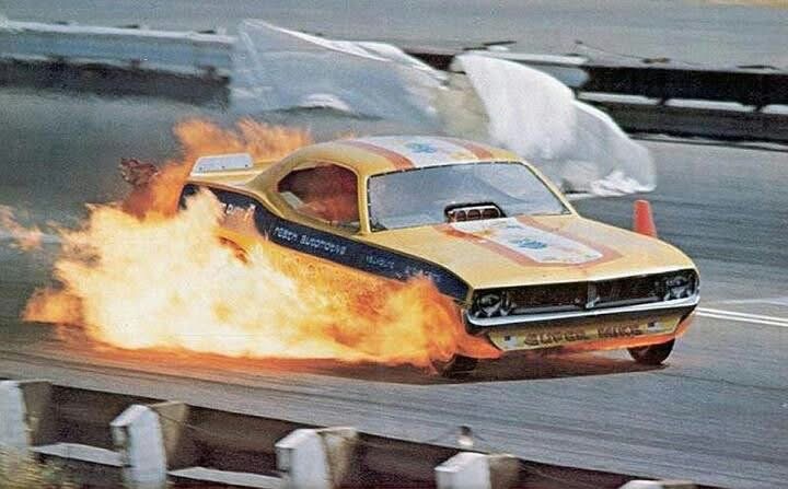 Notes: Fire photo (by John Shanks) included due to different appearance of this car, and to show it as highly likely Diedrich drove the car in 1973. Caption accompanying photo states “ During recent action at Orange County International Raceway, photographer John Shanks caught this spectacular shot of Mike Diedrich's Funny in flames after he lost his motor in the lights. Fortunately, Diedrich was unhurt.” However, knowing the long lead times and the use of photos to fill space, it is possible this was 1972, as it has been written that Diedrich “retired” at the end of 1972. Can anyone confirm? JM |
