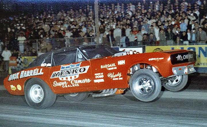 Notes: Real Style Camaro, Left Hand Drive, Vinyl Top. Dick ran 7.83 at 184.80 at the 1968 All American Funny Car Championships in Bristol. We need to confirm that those times were run in this car and not the Courtesy Chevrolet car (that I think ran this year, too). Former times listed for the Yenko car in 1968 were 7.945 at 171.80. |