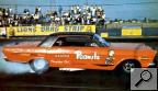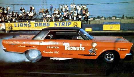 Notes: Blown fuel. 131" Sweet Shel chassis. Steel body, glass roof, vinyl trim. Car was run into 1967 season. - per the Jalopy Journal; The world's heaviest (and most unlikely) funny car. Although the body is fiberglass it was built for a Ford TV ad where the car was airlifted to the top of a remote location--a mesa if my memory is correct. When the shoot was over Sheldon Kornblatt purchased the body shell and built a chassis to suit. Fittingly Gary Cochran (of Mr C Ford powered AA/C fame) was one of the drivers who steered "Peanuts" during its career. |