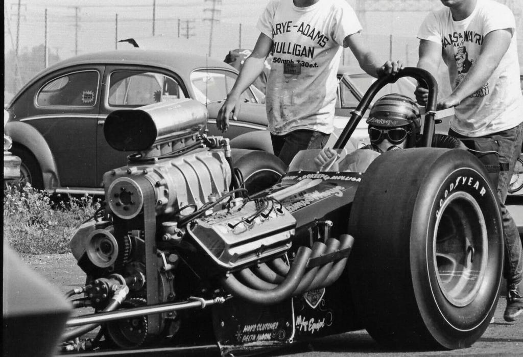 | Notes: Amazing times. Early in the year, ran 7.71/198.22 at Lions 2/01/66. | Ran 7.73/195.64 at Bakersfield March Meet 3/66. | Ran 7.30/212 at Pomona 4/66 beating the Surfers' 7.34. | Ran the first generally accepted 7.1-second time with a 7.16 at the AHRA Nationals at Lions in August, and two months later ripped the first six in a match-race at Carlsbad, Calif., with a 6.95. - Drag Racing Online | John ran six of the 20 quickest ETs in 1966 and three of the fastest 19 speeds. - NHRA | Runner-up AHRA Winternationals Irwindale. | John started the season by winning the Jackpot Circuit race at Carlsbad on Jan 9. He qualified second with a 7.62/199.10. He beat Dick Lechien and Bill Leavitt before running a 7.59/205 in the final to beat Tommy Allen's 7.90/208. On January 23 he was at Pomona for its Jackpot race. John qualified fourth with a 7.80/204.08. That wasn't bad considering that there were 34 cars going for the 16 positions. In round two, John lost to Dave Beebe. At the AHRA Winternationals at Irwindale, the team ran well, beating Tom McEwen in the semifinals, but losing an engine while winning. Unfortunately, they were unable to run in the final giving Bob Hightower a single for the win. John's 7.71/198.22 qualified #14 in the 32-car field at Lions for the UDRA Winternationals on February 26. He failed to reach the finals. At the Bakersfield March Meet, he ran on Saturday, March 5, for the hoped for "sit out" position for Sunday. Unfortunately, he fouled away a 7.67/195.22 in the first round. John had still qualified for Sunday's show, but he got out of shape in the first round, of eliminations against Mike Snively and lost. The team was at Lions for a sixteen-car show on March 26 where a 7.89/198.66 qualified #7. He beat Gary Casaday in the first round, with a 7.96/196.50, but lost in the next round. Another sixteen-car show was run at Irwindale on April 2. Mulligan beat Dwight Salisbury in the first round, with a 7.76/199.54 before slowing to a 10.64/91.63 second round loss to Dave Beebe's 7.70/210. He won at Lions over an eight-car field on April 9. He qualified #2 with a 7.37 and ran a 7.88/160.71 over Bivens and Fisher in the first round. In the semifinal, Connie Swingle fouled against him and he ended up winning by beating Roy Thode in the final with a 7.65/170. Another win came their way on April 17 at Riverside for a Jackpot Circuit event. John qualified #1 with a 7.67 and he set Low ET with a first-round 7.61, beating Jack Ewell. In the semifinal, a 7.80 beat Tommy Allen who shut off early. In the final, a holeshot 7.95/205.00 beat Paul Sutherland's quicker 7.83/188. The following day (April 18) found them all Lions for an eight-car show. Again John qualified #1; this time, a Low ET of the meet 7.47 at 205.46 got him the spot. Nick Marshall fouled against him in the first round, and Connie Swingle did the same in the semis. John's two runs were 8.05/138.46 and 9.37/106.00, but here he was in another Top Fuel final round. Unfortunately, a final round 8.03/146.34 was no match for James Warren's 7.72. John was runner-up at Lions again on April 23 when he fouled away a 7.57/197.80 against Beebe in the final. Mulligan qualified second with a 7.68/181.08 and had run a 7.85/179.64 over an out of shape Warren and an 8.26/146.10 beat Krohn and Angeleri's Injected Chevy fueler in the semifinals. It was on April 24 that the drag racing world really started to notice the Adams-Warye-Mulligan team when they were at Pomona for a Jackpot Circuit race. In the first round, John soared to Low ET and Top Speed with a 7.30/219.50 drilling of Allen. In the second round, he faced Chuck Griffith, but John's clutch was failing and the car pulled through the beams and fouled. He still ran a 7.43 in the loss. They ran at Beeline's Fuel and Gas Championships on April 30 and even though they beat Glenn Brown in the first round, with a 7.66; the speed of 180.36 showed that they hurt their engine and were unable to run in the semifinal. Lions held a sixteen-car show on May 14, and a 7.96 qualified in the middle of the field. John shut off early in the first round, and his 8.08/142.65 lost to Larry Faust's engine blowing 8.14/182. Since Faust was unable to return, John got back in on the "break rule", but lost again with an ailing 9.58 losing to John Edmunds' 7.92/201. The team traveled to Sacramento on May 22 for the Division 7 points race and qualified with a 7.97 at only 159.50. They failed to reach the finals. John set Lions track records of 7.31/216.34 while qualifying #1 on May 28 for a sixteen-car show. In the first round, he beat Ron Goodsell's 7.85/200 with a 7.39/213.76, but Beebe's 7.59/207 beat John's quicker 7.51/204.54 in the second round. Mulligan set Low ET in qualifying #1 at an eight-car show at Lions on June 11. His 7.42/203.16 led the field, but in the first round, his 7.51/187.50 beat Beebe, but a cylinder wall collapsed and they had to withdraw from competition. John cracked off a Low ET 7.24 at 219.50 to lead qualifying at Riverside for the HRM Championships. Unfortunately, he lost to Mike Sorokin in the first round. He did better at Irwindale on July 9 where he set Low ET and Top Speed in qualifying at 7.44/214.00. Another 7.44 at 205.94 beat Allen and a 7.50/206.88 beat Ron Hampshire in the semifinals. In the final, he met Danny Ongais who lost a clutch on the line and Mulligan won with a 7.53/213.28. Another win came at Carlsbad on May 29 where he qualified #1 with a 7.49 at a track speed record of 221.12. He ran 7.87/215.30 and Low ET of the meet, 7.44 at 218.44 in the rounds leading up to the final where a 7.91/203.16 beat Tommy Allen's 8.27. On August 7, Mulligan ran 7.16 to qualify first at Lions for the AHRA World Championships. A first-round 7.31/218.44 (Top Speed) beat Bob Brooks, but in the second round, the car failed to fire. Dave Beebe met John at Irwindale on August 20 for a best of three match race. This was big as Dave was winning a lot of races at the time. John w