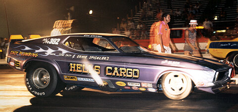 Notes: Former Jerry Ruth Mustang. - Pictured "way out west" at Irwindale is the Colorado based "Hells Cargo" Mustang of Ernie Spickler and Tom Cacy. Car was ex-Jerry Ruth Pay-n-Pak Mustang that the team ran from the early 70s through 76. Drivers included ex-Jeg's shoe Bob Durban and Mike Snively. Hell's Cargo cars were "High Country" regulars, ran division meets and match races throughout the Rocky Mountain region. (Photo by John Shanks, info courtesy of Doug Jordan, from 70sfunnycars website) - JM |