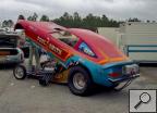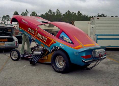 Notes: Smith debuted his new Monza at the NHRA Gatornationals. On his first qualifying attempt, he ran 6.70. Paul improved to 6.422/208.33 to qualify #2 behind Don Prudhomme's 6.39/205. He lost a close one in the opening round, where his 6.525/206.42 lost to Billy Meyer's 6.51/200. Paul was at Warner Robins in April for the NHRA Division 2 Opener. He qualified #2 behind Shirl Greer, and these two made their way into the final. The two had a great race, with Greer running 6.40/219 to win over Smith's hard-charging 6.41/229.00 (Top Speed). Not long after this, he was at Englishtown for its Spring Funny Car Championships. It was an eight-car show, and in the opening round, Smith smoked the tires and lost to eventual winner Pee Wee Wallace. Smith came back out later for a consolation race against Dodger Glenn, driving the "Frantic Ford." Paul ran 6.93/193.96 to beat Glenn's 7.57/188. Paul qualified #15 at Columbus at 6.623/199.11. In round one, he lost to teammate and Division 2 nemesis Greer, 6.469/205.94 to 7.349/118.57. Paul got into the top half of the field at NHRA Englishtown with a 6.450/209.79 that qualified #8. He beat a broken Ron Jackson in round one (12-second shutoff) but crossed the centerline against eventual winner Jim Liberman in round two. The team qualified #7 at NHRA Sanair with a 6/63/218.97, but Paul lost a close one to Bob Pickett in the first round, 6.51/207.37 to 6.61 216.86. The team qualified well at Indy, claiming the #6 spot at 6.292/226.13. Paul lost another close one in round one, however, this time to Dale Pulde, 6.340/211.26 to 6.401/210.28. The team's next and final NHRA national event was the World Finals, where Paul was the fourth alternate at 6.439/217.90. Photo from the 1975 NHRA Gatornationals, Gainesville, Florida. Shirl Greer team car. |