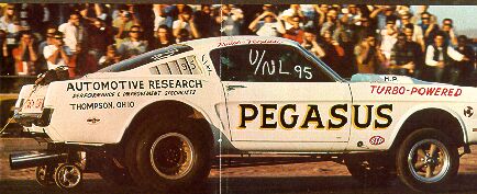 Notes: One of the better-known Turbonique-powered cars. Rauth & Venetti later ran a similarly powered Cougar funny car, also called Pegasus. - RT | Thompson was his hometown, and the rest of our very small family. There is a photo of him in California that Hot Rod magazine did a small write-up on, titled "truth is stranger than fiction"; they said he was running 8s. He ran all over the US just to hit that green button again. - Mark Rauth (nephew) (Hot Rod Magazine) |