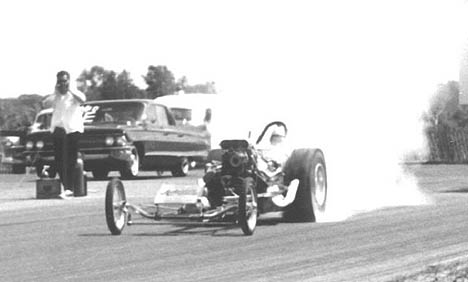 Dave Anderson burns out in his Top Fuel Dragster in 1965. Photo thanks to Ron Johnson